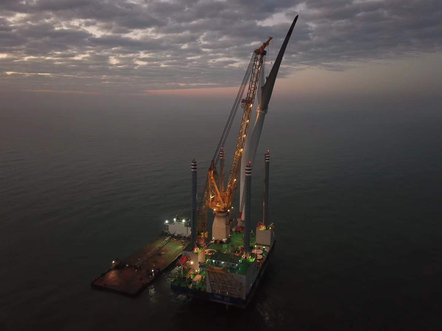 一航亨通海上風(fēng)電作業(yè)平臺(tái)總長(zhǎng)120.5米,型寬38米,型深6.8米,是集“風(fēng)電基礎(chǔ)施工、風(fēng)電塔筒、塔架、機(jī)艙、輪轂、葉片”安裝與維護(hù)為一體的風(fēng)電作業(yè)平臺(tái)。該平臺(tái)艏部設(shè)有2臺(tái)600kW、艉部設(shè)有2臺(tái)1300kW的全回轉(zhuǎn)舵槳,用于海上風(fēng)電場(chǎng)包括基座安裝、塔架、機(jī)艙以及葉片吊裝等施工作業(yè)。