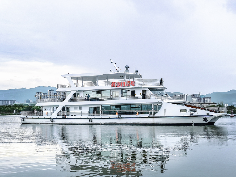 “滇池和諧號(hào)”船長(zhǎng)39.8米,型寬10米,雙體船,B級(jí)航區(qū),載客150人,動(dòng)力系統(tǒng)搭載中國(guó)船舶無(wú)錫賽思億S-Renewable 新能源電力推進(jìn)系統(tǒng),整船配置鋰電池總?cè)萘抗灿?jì)1198kWh,2臺(tái)75kW推進(jìn)電機(jī),用于昆明滇池高原湖泊的觀光游覽服務(wù)。