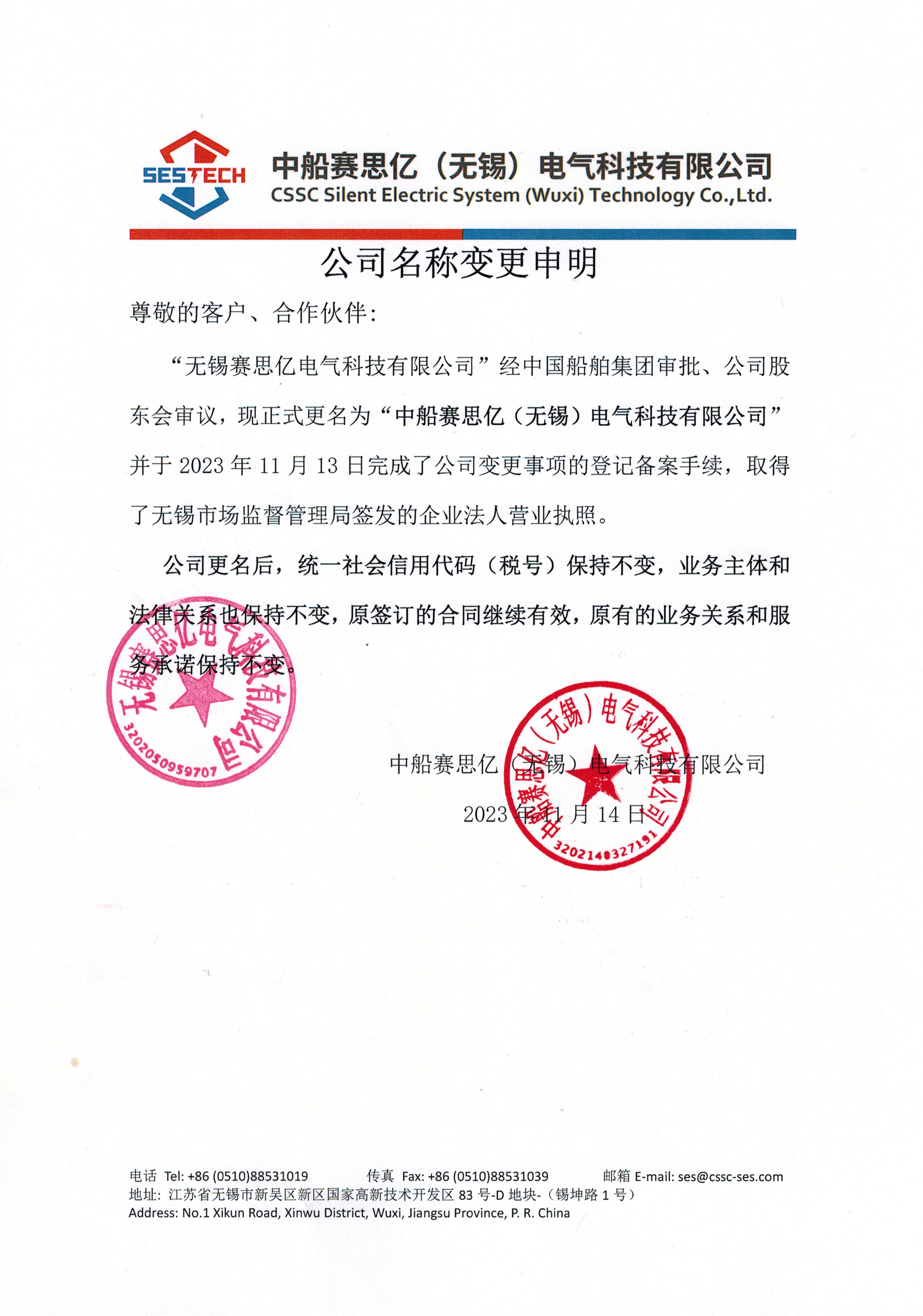 經(jīng)中國船舶集團(tuán)審批、公司股東會審議,2023年11月13日,無錫賽思億電氣科技有限公司正式取得無錫市場監(jiān)督管理局簽發(fā)的企業(yè)法人營業(yè)執(zhí)照,更名為“中船賽思億(無錫)電氣科技有限公司”,簡稱“中船賽思億”。