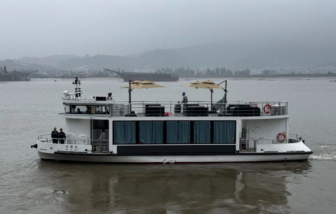 “閩都號”20.8m純電動游船,是福建福州兩江四岸客運(yùn)有限公司投資新造的第二艘現(xiàn)代純電動游船,用于“閩江之心”航線“煙臺山碼頭—蒼霞碼頭”對渡游中。“閩都號”游船總長20.79米,型寬5.1米,采用賽思億純電力推進(jìn)系統(tǒng),該船由長江船舶設(shè)計院有限公司設(shè)計,福建東南造船廠有限公司福寧重工基地建造,船舶可容納乘客76人,采用低污染、低排放、低噪音的純電動力。