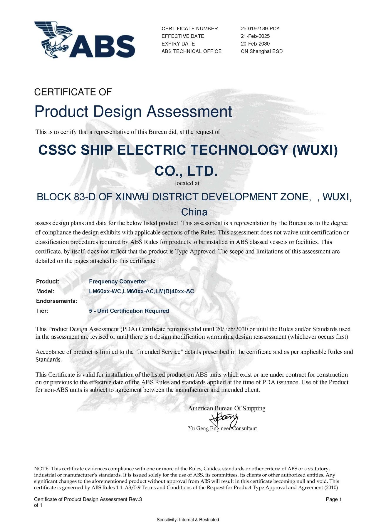 2025年2月21日,中船賽思億(無錫)電氣科技有限公司(CSSC Ship Electric Technology ( Wuxi) Co.,Ltd.)核心變頻電控設(shè)備順利取得美國船級社(ABS)型式認可證書,成為國內(nèi)為數(shù)不多的取得美國船級社(ABS)型式認可證書的船舶電力推進企業(yè)。目前中船賽思億已取得CCS、BV、RINA、DNV、LR、ABS等六大國際主流船級社型式認可證書,是目前國內(nèi)唯一一家擁有六大船級社型式認可證書的國產(chǎn)船舶電力推進企業(yè),對中船賽思億的海內(nèi)外市場開拓和國際化發(fā)展進程,具有重要意義。